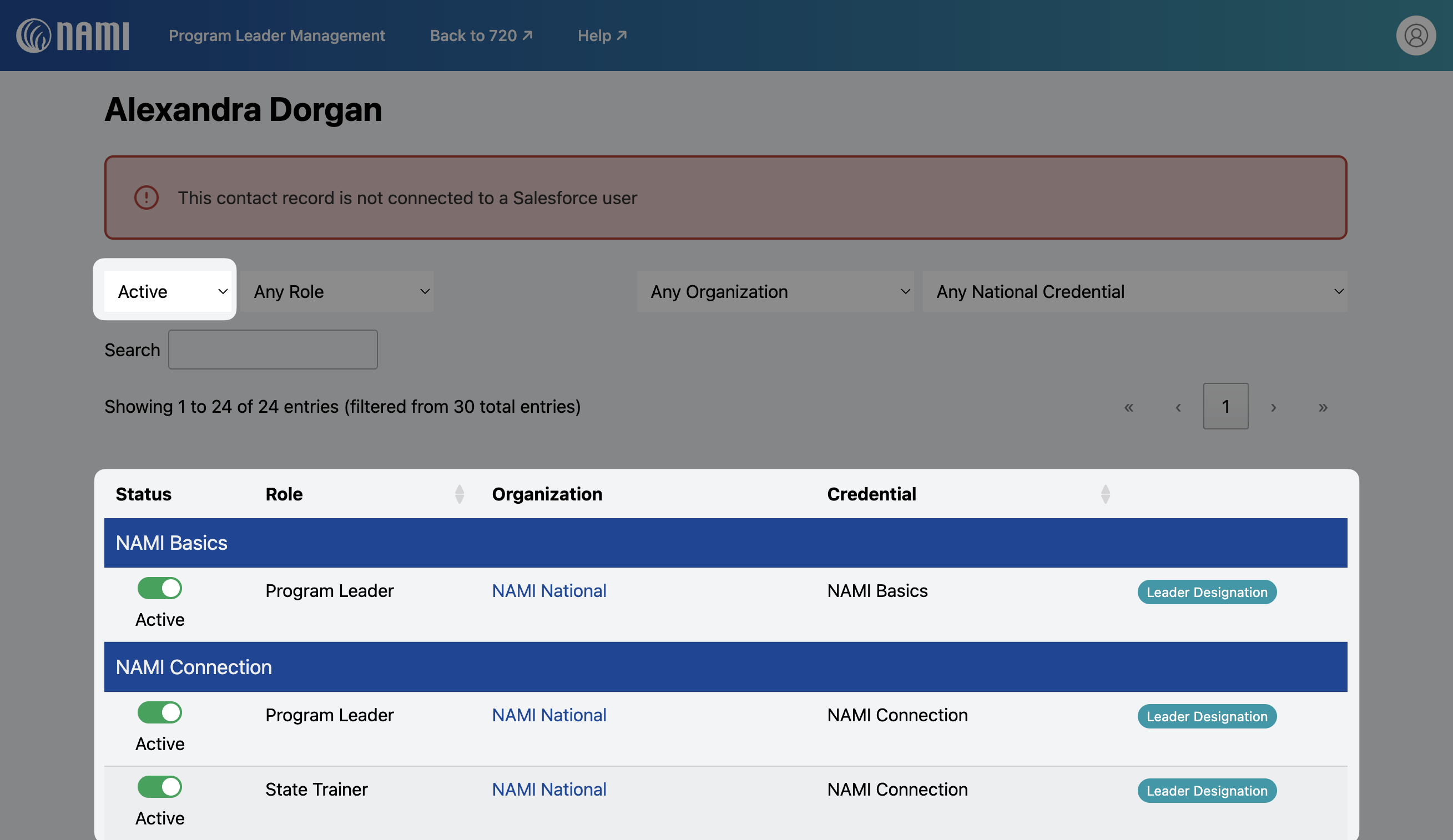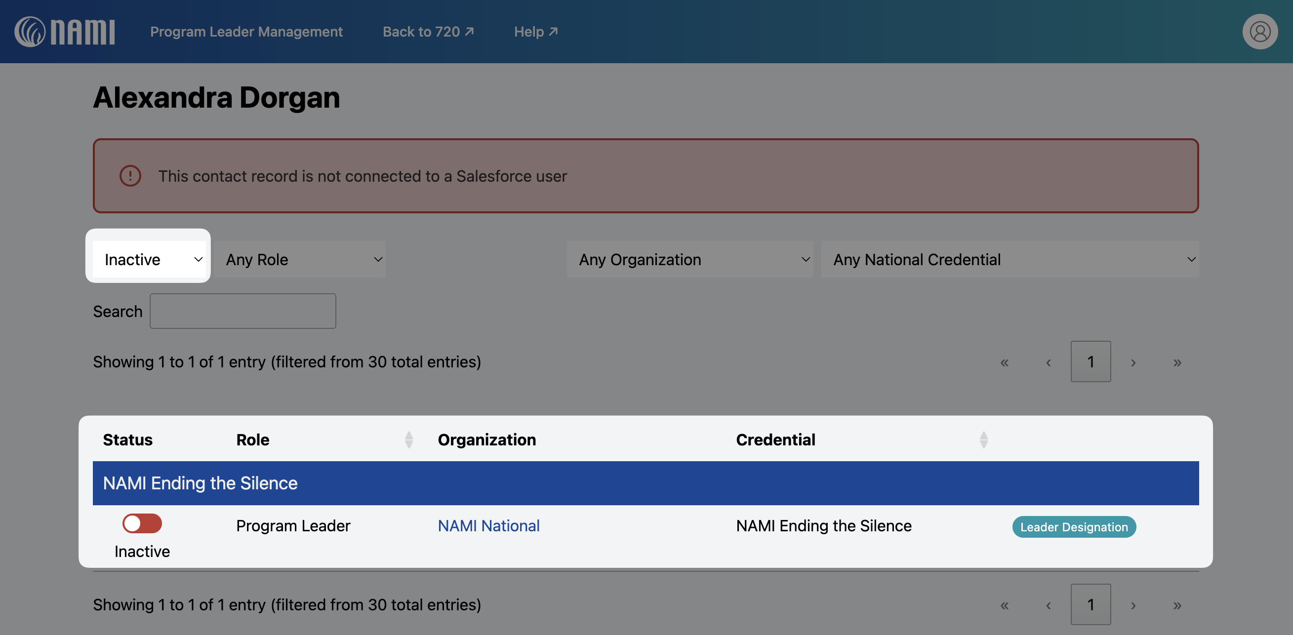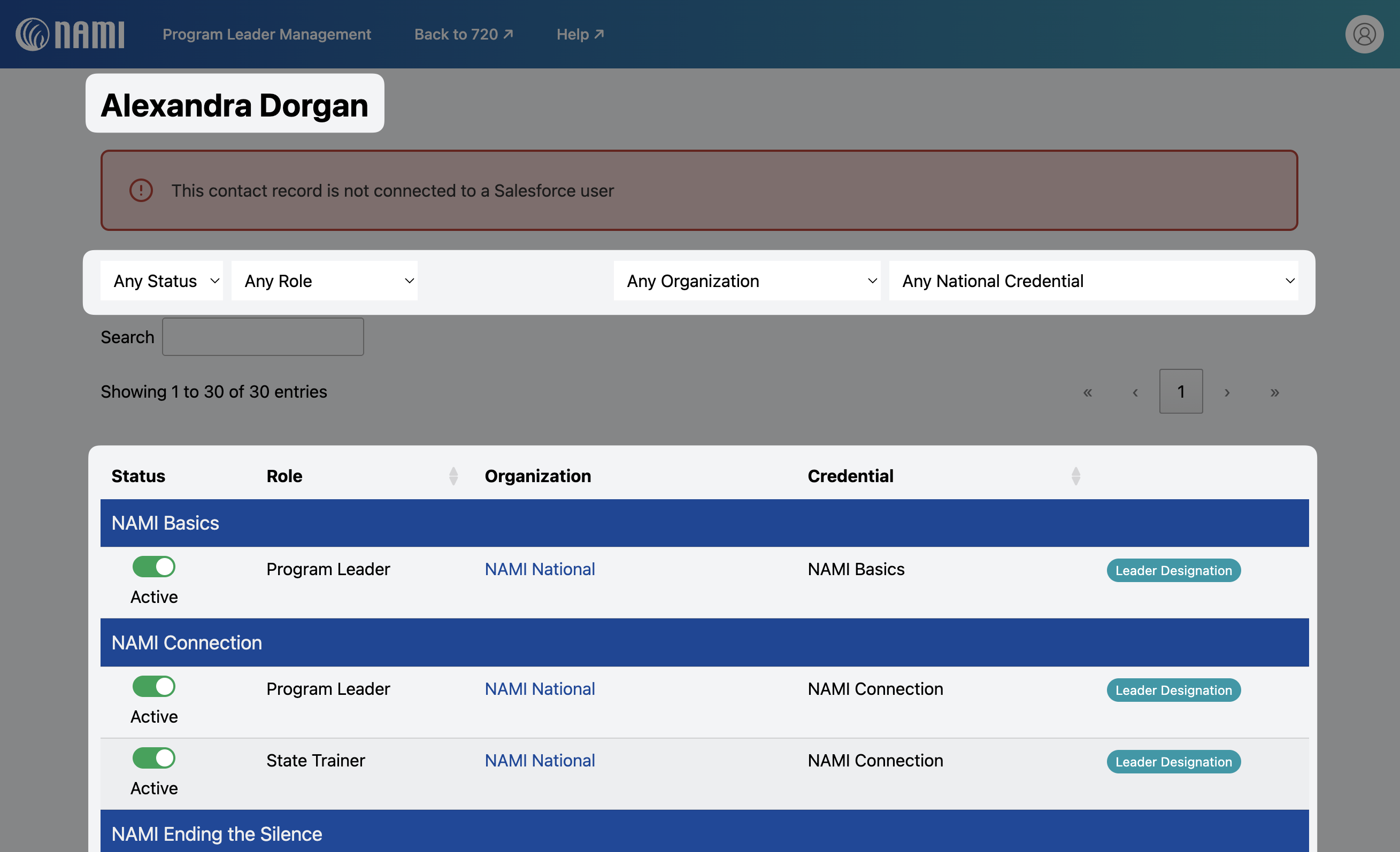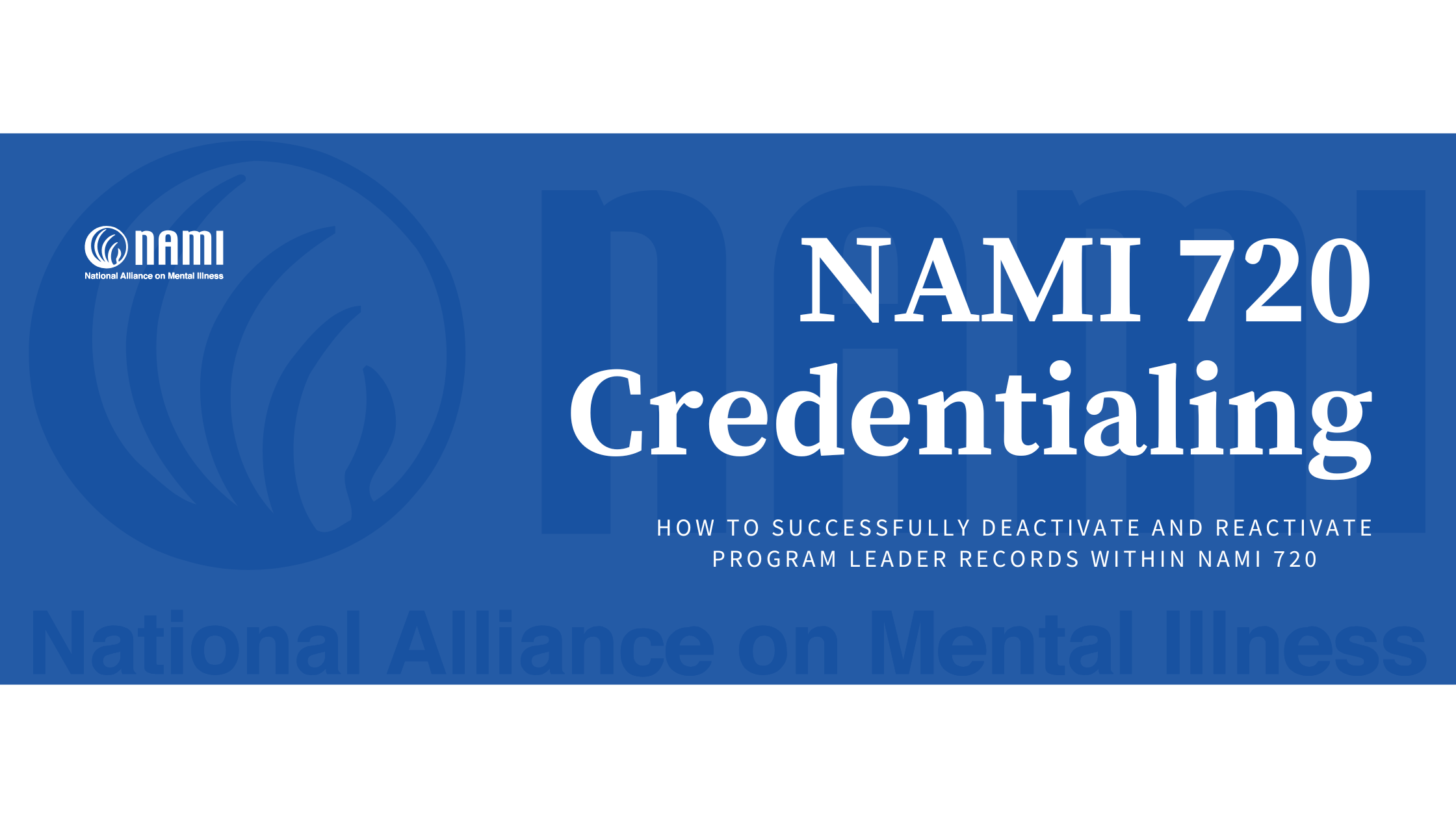 NAMI 720 Credentialing provides a long awaited way for NSOs and Affiliates to manage their currently active and inactive program leaders. While you will still add new leaders and manage records within NAMI 360, through NAMI Credentialing you will now be able to deactivate inactive program leaders that no longer facilitate programs within your NAMI State Organization or NAMI Affiliate, as well as reactivate records for any returning leaders!