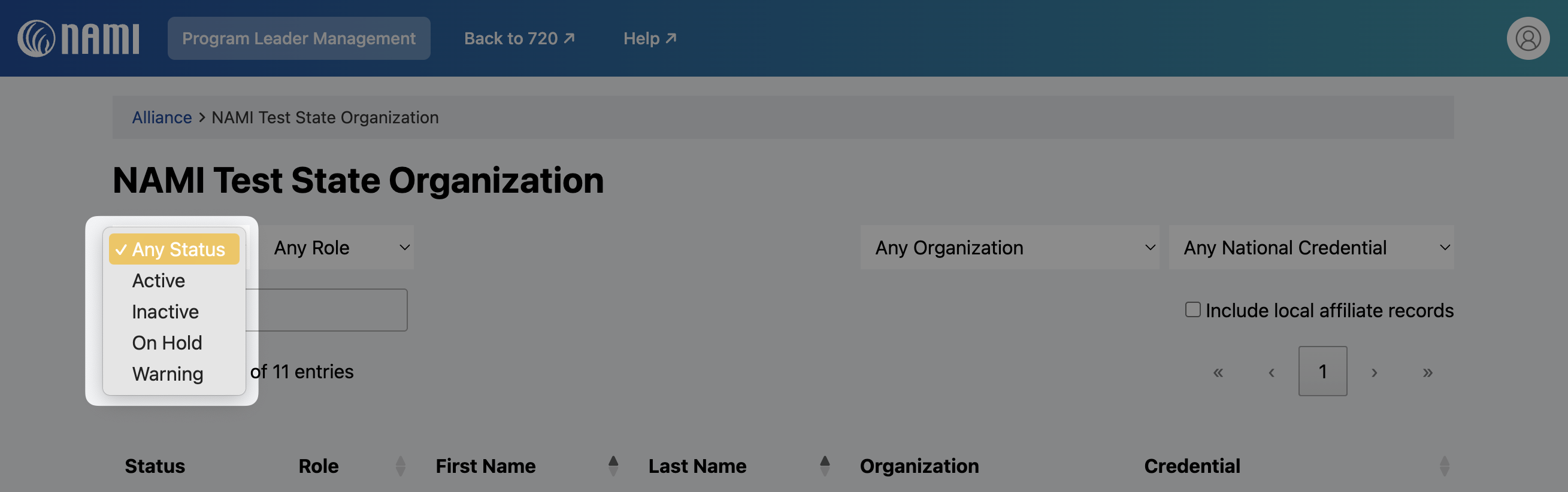 - You may filter by status Active (active program leader records), Inactive (inactive program leader records), On Hold (program leader records which are highlighted yellow when a local record is connected to an inactive leader designation - these are not included in the active and inactive filters) , or Warning (program leader records which are highlighted red due to error or record misconfiguration - these too are not included in the active and inactive filters)