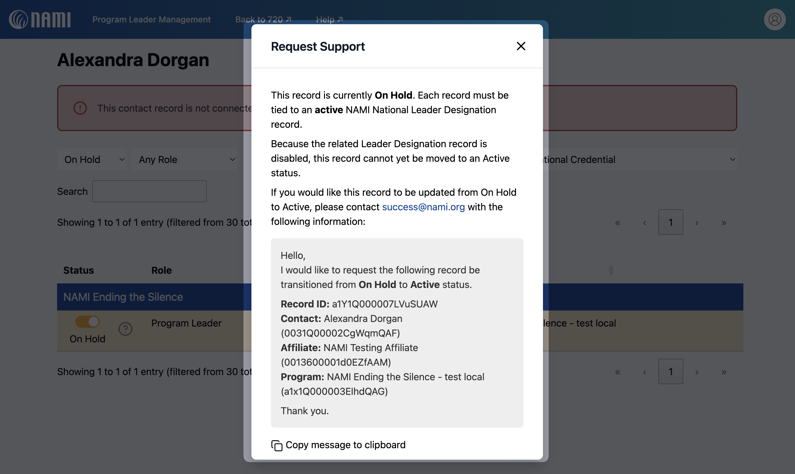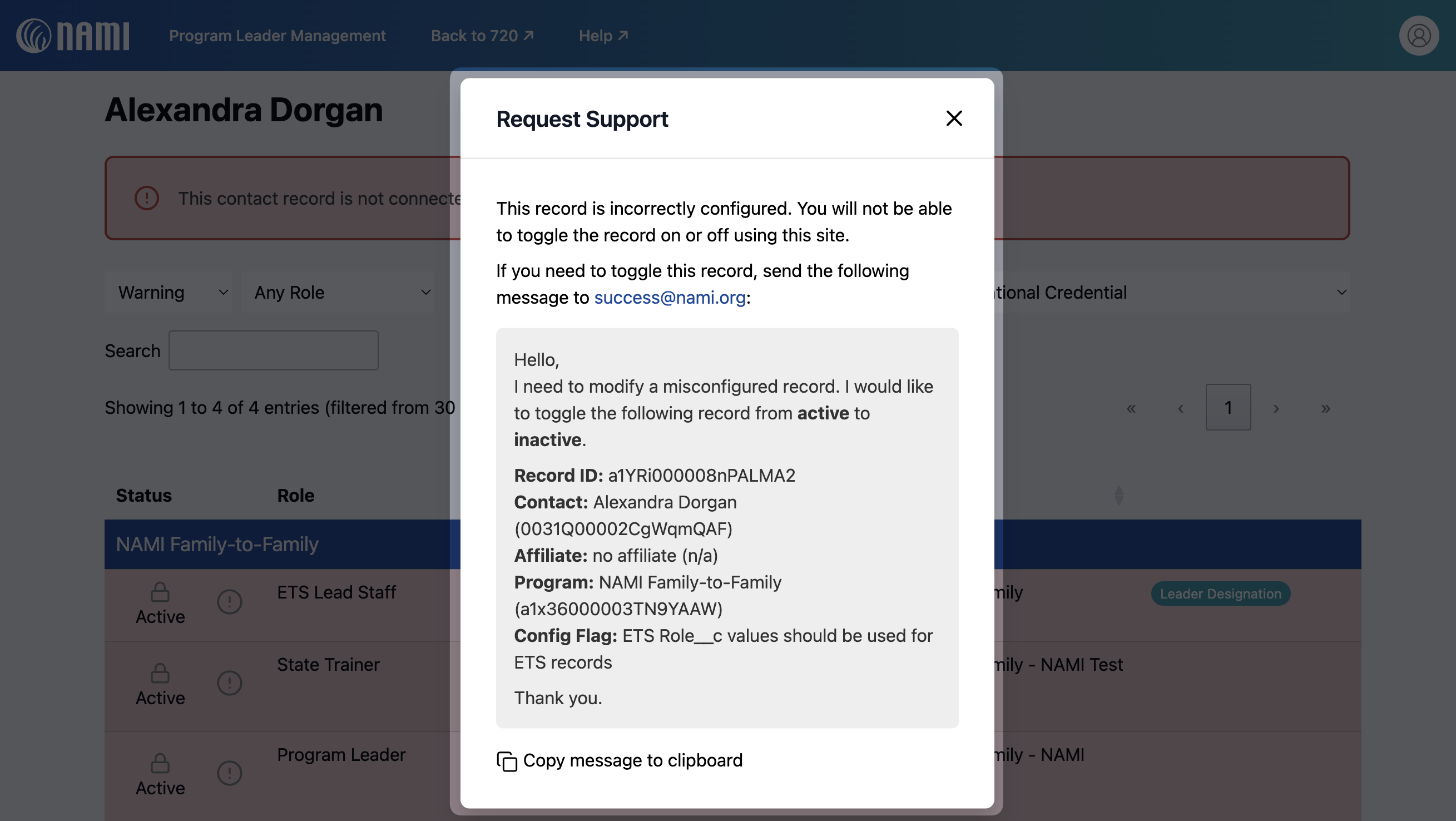 If you encounter a record that is misconfigured and you would like to toggle the record, you will need to reach out to success@nami.org. If you click on the (i) bubble to the right of the lock on the record you will find you can clip/copy the information and paste it within the body of your email. These details will help to expedite the process of correcting the errors presented on misconfigured records and inform the Success Team with relevant information on which record you want to modify and why the record was flagged as misconfigured.