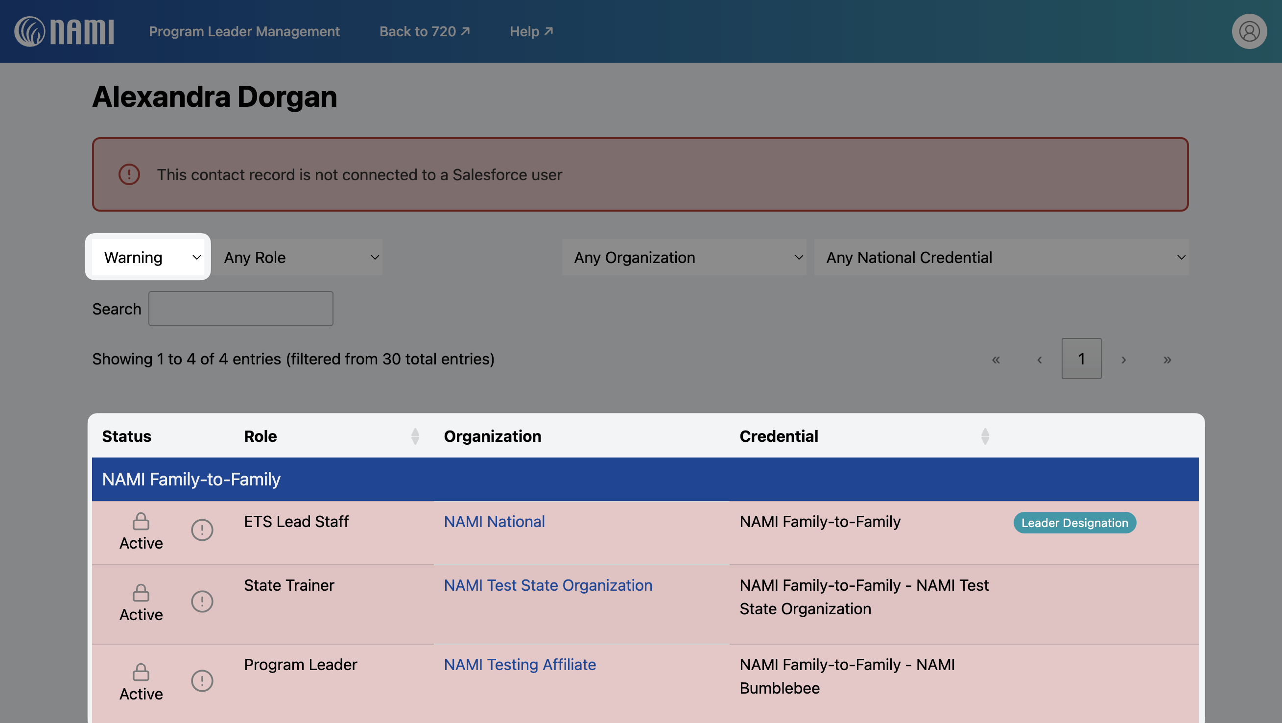 Any toggle button with a padlock icon underneath is locked, and the record may not be updated through Program Leader Management. If a record is misconfigured, it will appear under the Warning status, will be locked, and will appear highlighted with a red background. This may occur due to lack of permissions (for example, users cannot update their own leader designation records) or if the program leader record is misconfigured or not connected correctly within NAMI 360.