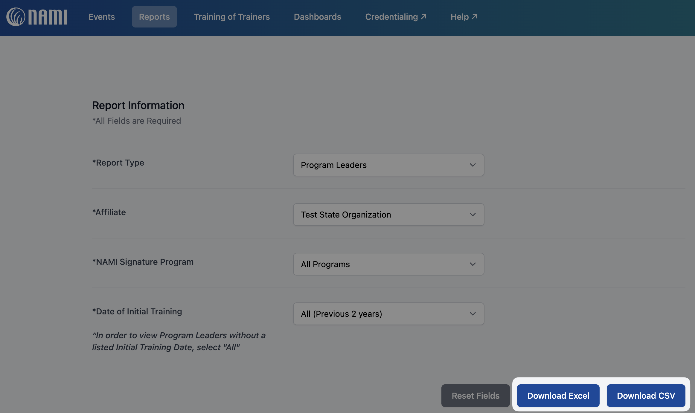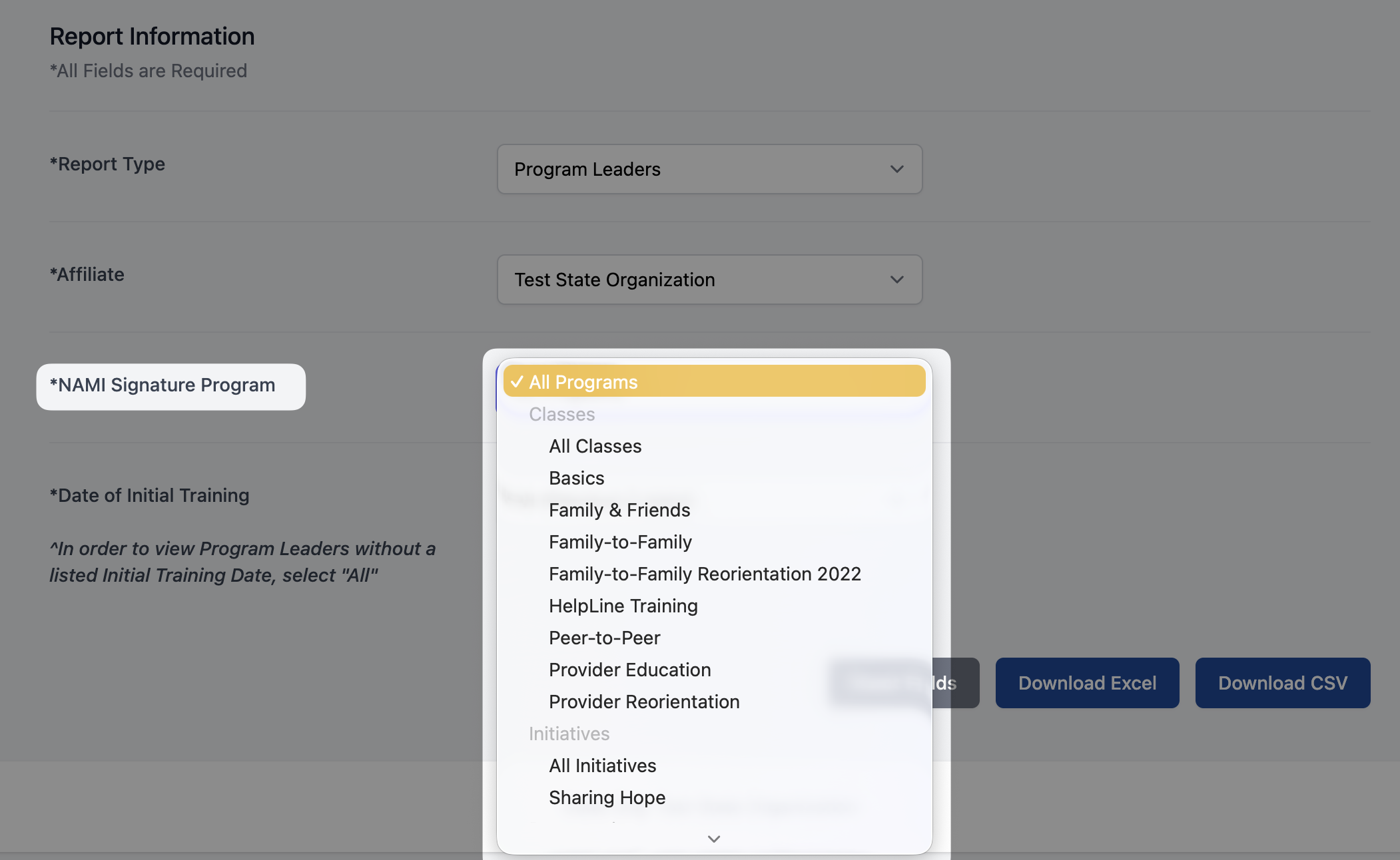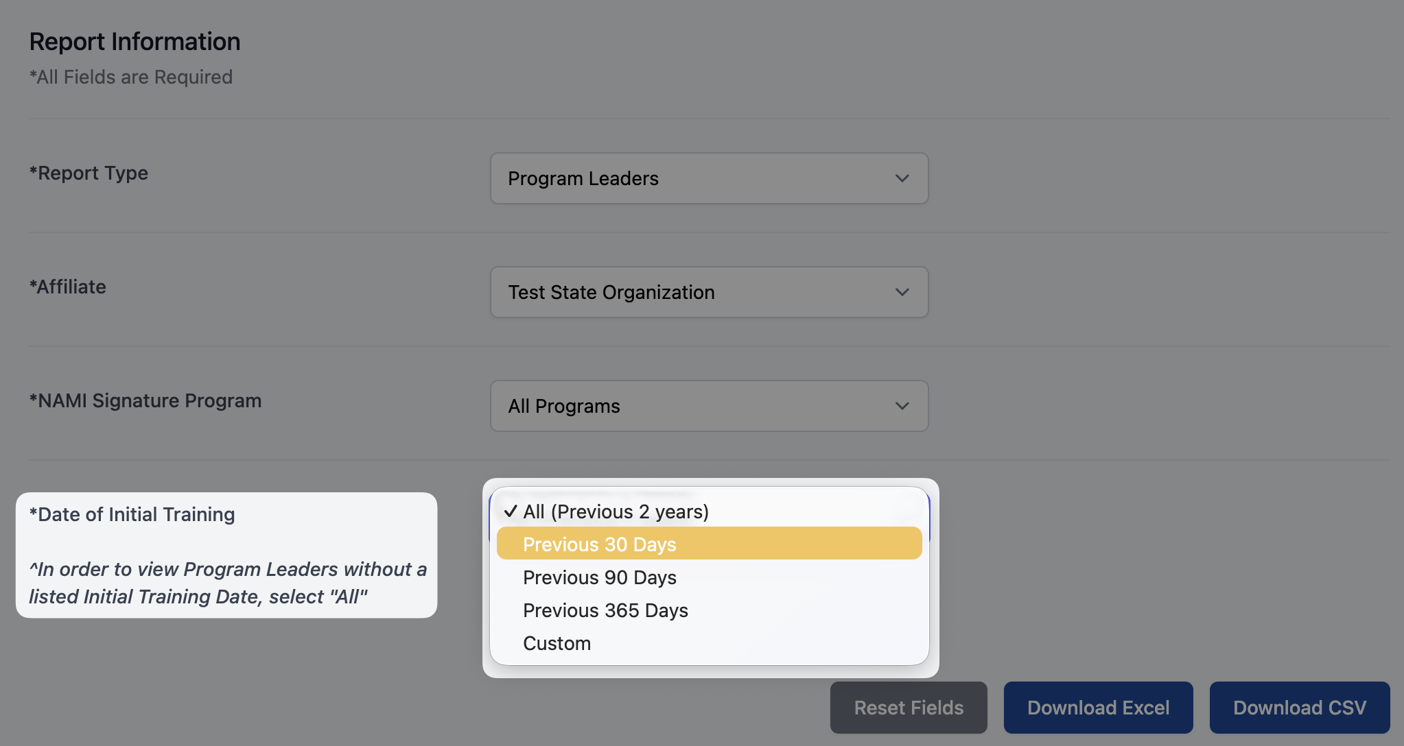 Please Note: In order to view program leaders without a listed "Initial Training Date", please select "All"